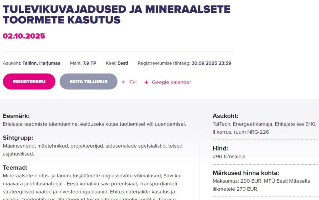 Eesmärk: Erialaste teadmiste täiendamine, eelduseks kutse taotlemisel või uuendamisel. Sihtgrupp: Mäeinsenerid, mäetehnikud, projekteerijad, siduserialade spetsialistid, teised asjahuvilised. Teemad: Mineraalsete ehitus- ja lammutusjäätmete ringlussevõtu võimalused; Savi kui maavara ja ehitusmaterjal – Eesti kohaliku savi potentsiaal; Transpordiameti strateegilised vaated ja investeeringuplaanid; Ehitusmaterjalide kasutus ja vajadus teedeehituses; Strateegiad teisese toorme ringlussevõtul. Teisese toorme kasutusvõimalused ja regulatiivne raamistik. Õpiväljundid: […]